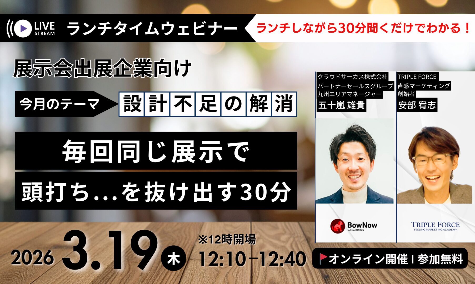 【2026/3/19 ランチタイムウェビナー】今月のテーマ:設計不足の解消「毎回同じ展示で頭打ち…を抜け出す30分」