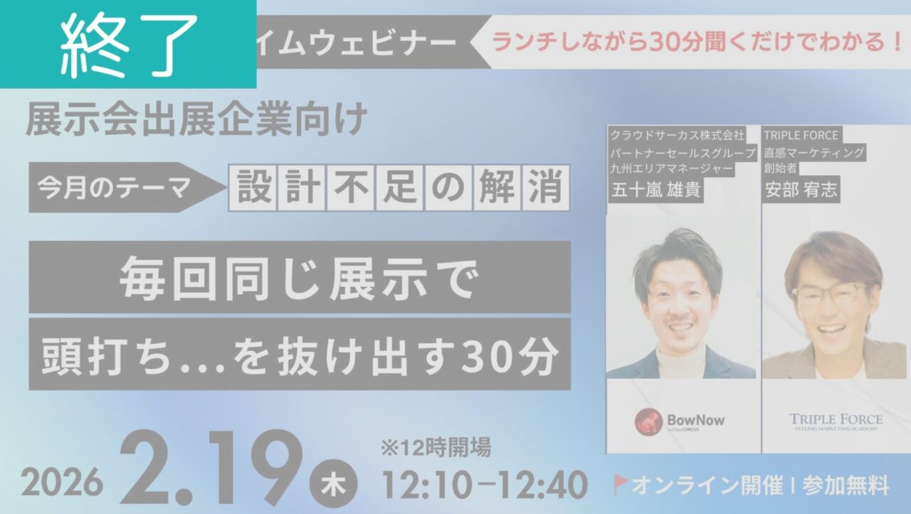 <開催終了>【2026/2/19 ランチタイムウェビナー】今月のテーマ:設計不足の解消「毎回同じ展示で頭打ち…を抜け出す30分」